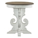 Liberty Magnolia Manor Round End Table in Antique White 244-OT1022. Accent your space with the perfect blend of European design with the Magnolia Manor round end table. Crafted of poplar solids with white oak and birch veneers, this piece features a fancy face top finished in a weathered brown with whitewash, and unique scrolled pedestal base with bracket feet. Warm antique finishes and artistic distressing along with grand scale create a piece to be passed to generations.